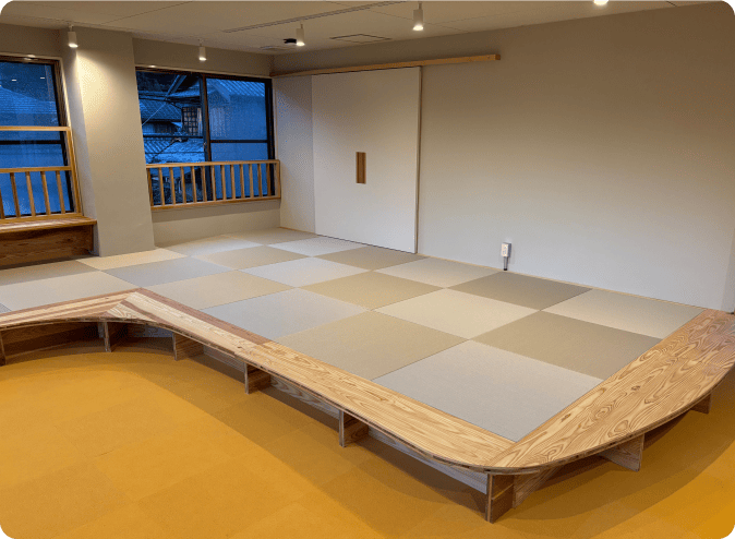 地域のみなさんが自由に集い、おしゃべりしたり、誰かと何かを作ったり、お茶や食事の時間を楽しんだりできる交流スペースです。キッチンや大きなテーブルのあるリビングのほか、スタッフが集めた本が並ぶ図書館や乾燥機が使える便利なランドリーも。小上がりの畳空間もあるので、寝転んでお昼寝だってできちゃいます。